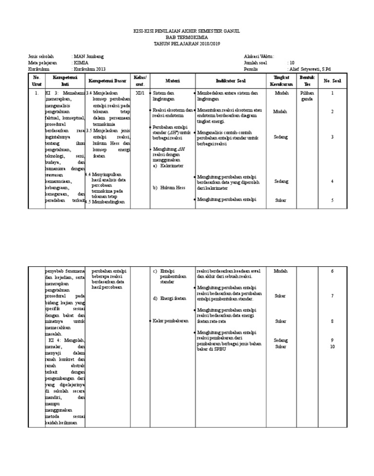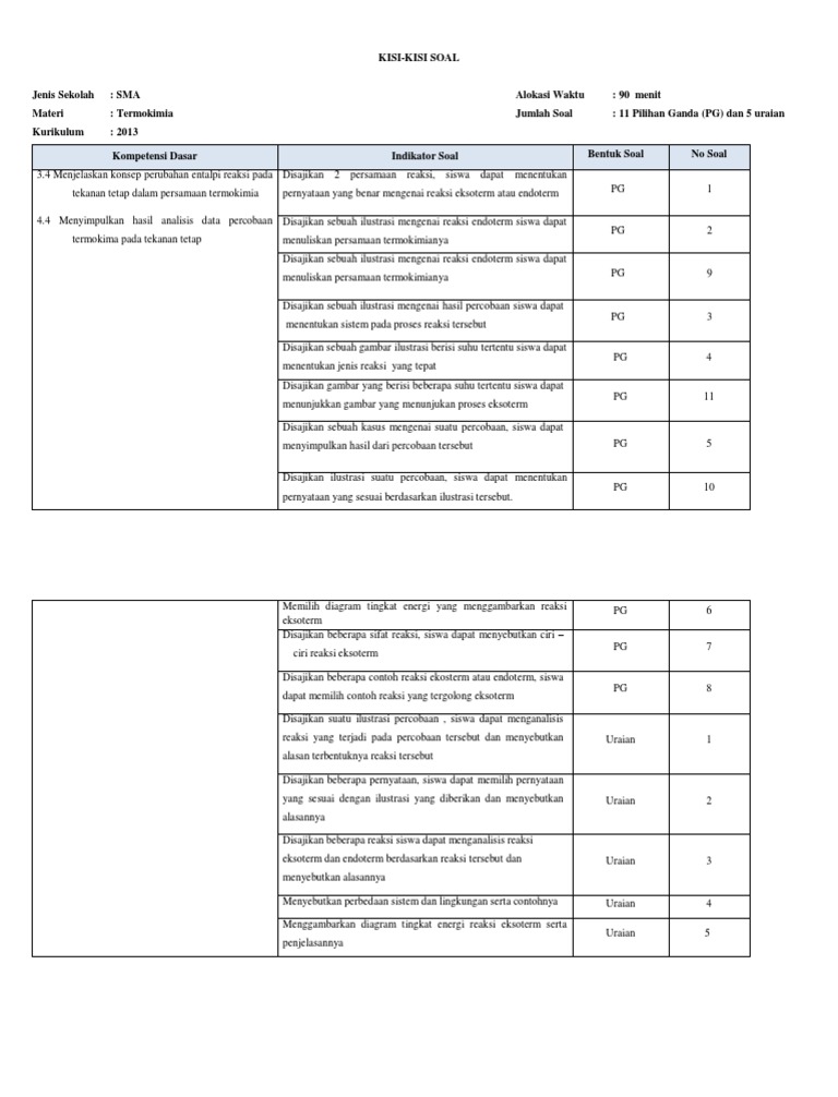 Berikut 20 soal tentang bab termokimia yang bisa kalian gunakan sebagai bahan untuk belajar di rumah atau bagi guru dapat digunakan sebagai tambahan bank soal dikelas atau untuk ulangan harian. Contoh soal pilihan ganda pg dan jawaban sejarah kelas xi semester 2 berisikan materi yang sama dengan contoh soal essay sejarah beserta jawabannya kelas 11 semester 2 bagian pertama yaitu mengenai. Nov 03, 2014 · sebelum mengerjakan soal, tulislah terlebih dahulu nama, nomor absen, dan kelas pada lembar jawab yang telah disediakan. Termokimia merupakan suatu cabang ilmu kimia yang mempelajari tentang suatu perubahan kalor atau energi yang menyertai suatu reaksi kimia, baik yang diserap maupun yang dilepaskan. May 14, 2017 · soal dan pembahasan kimia kelas 11 semester 1.